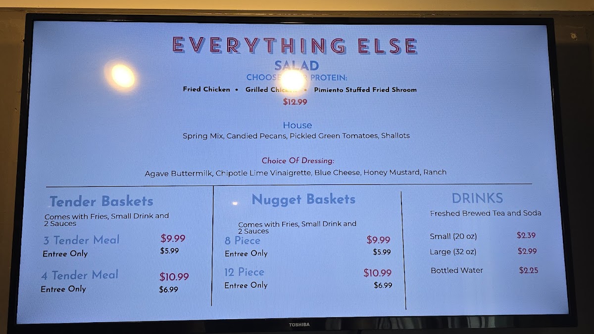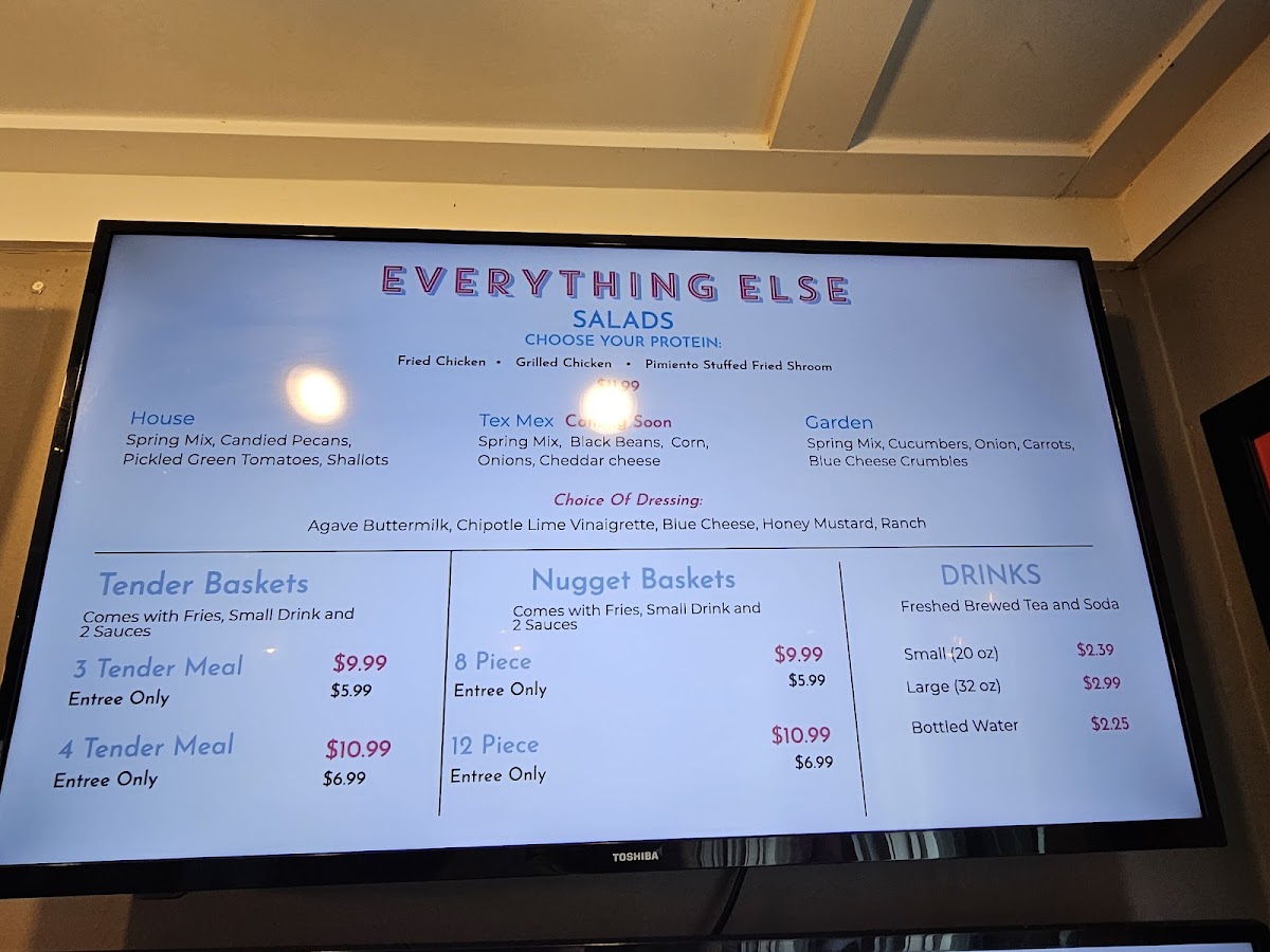 Fresh greens with choice of fried chicken, mushroom cap, or no protein.
