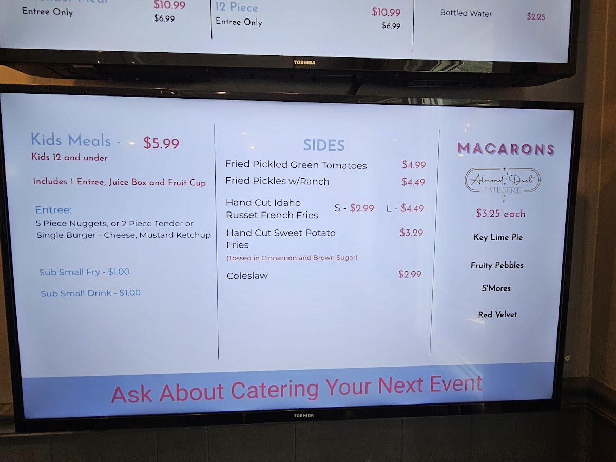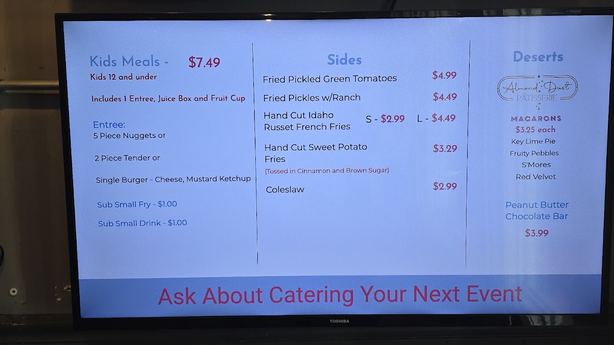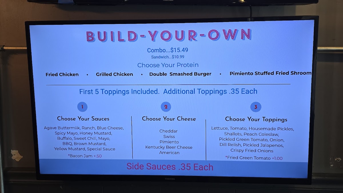 Choice of bacon jam, ranch, honey mustard, spicy mayo, blue cheese, buffalo, mayo, or BBQ.