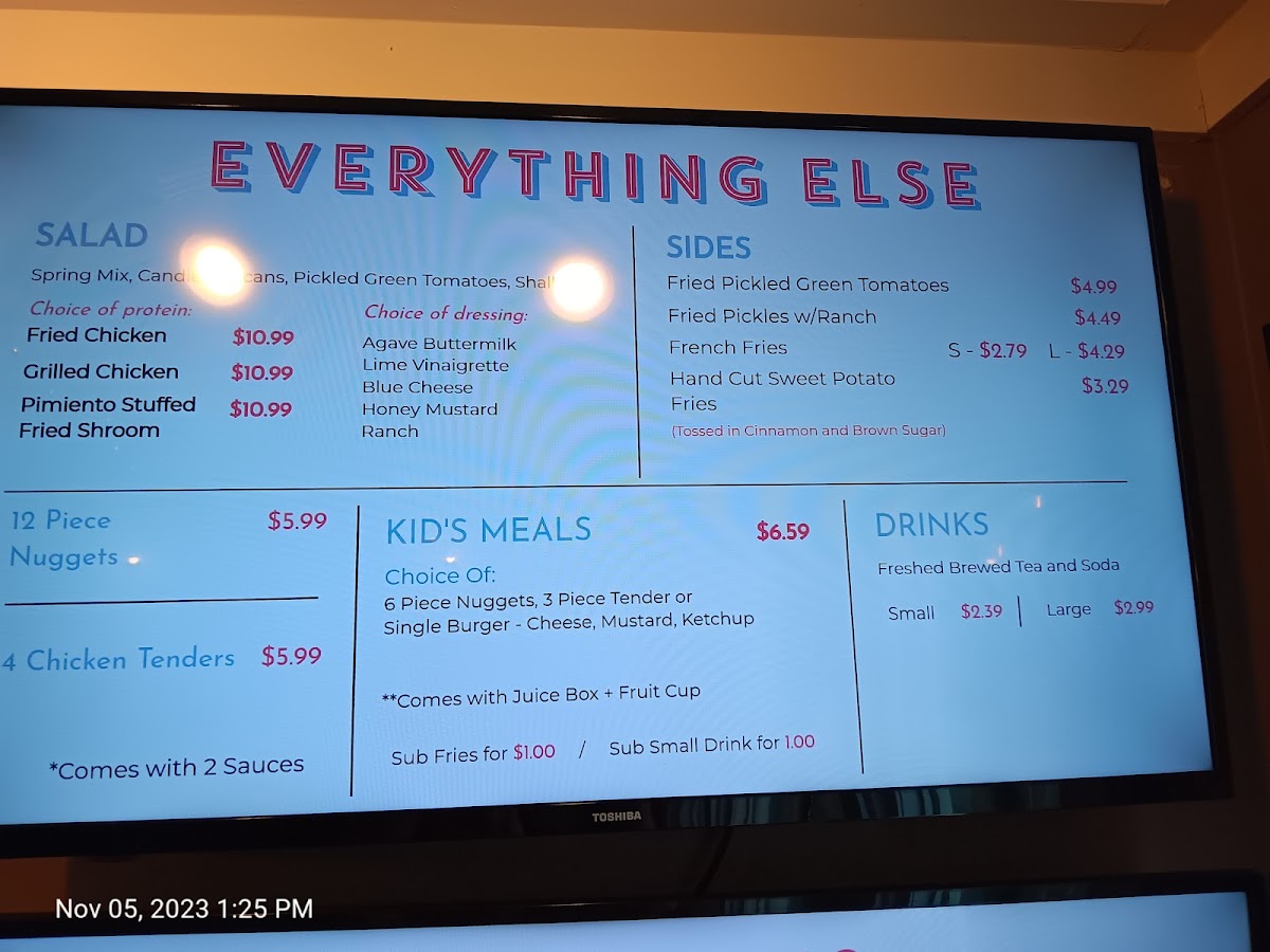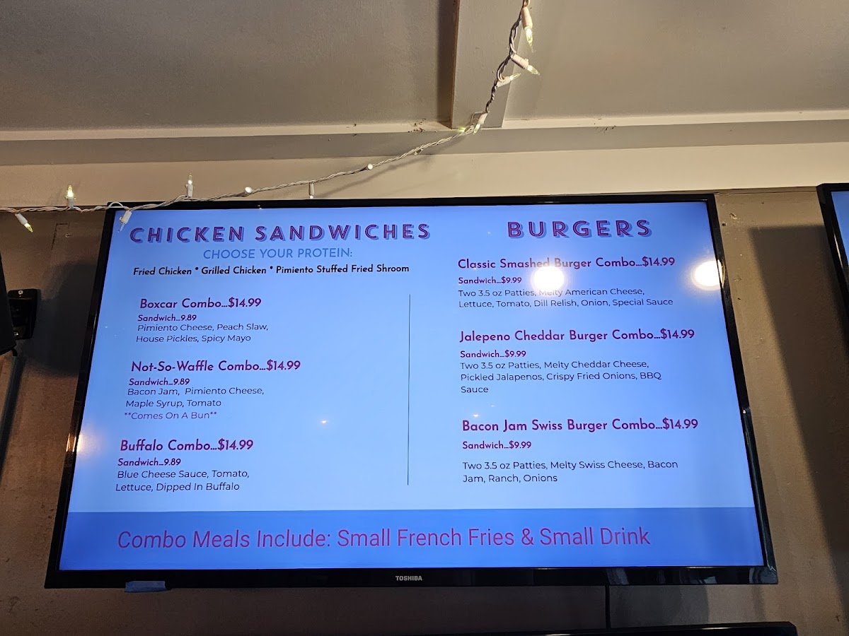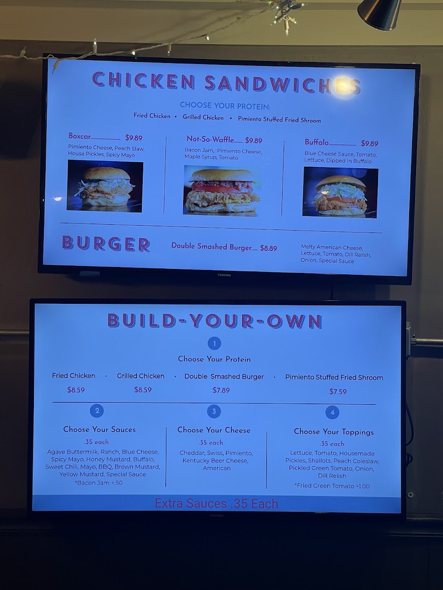 The Boxcar comes with Pimiento Cheese, Spicy Mayo, Pickles and Peach Coleslaw.
